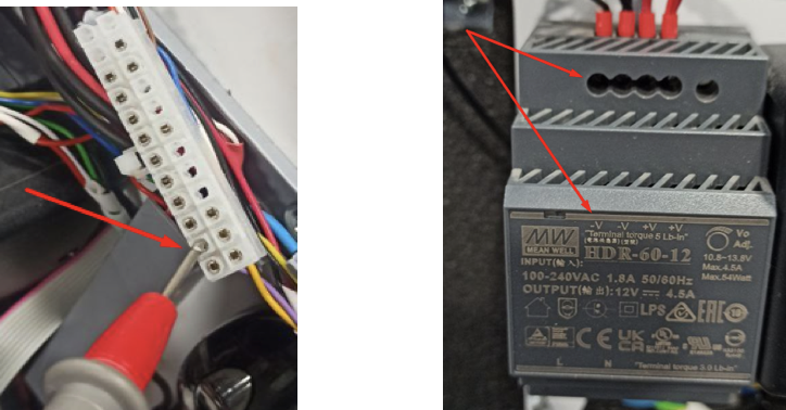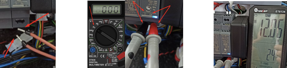 \- индикация не горит. Необходимо отсоединить провода от блока питания (рисунок 6), проверить мультиметром напряжение (режим измерения постоянного тока, 20В) (рисунок 7), если блок питания работает, т.е показывает значение, как на рисунке 8, то необходима замена обогрева в сборе.