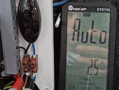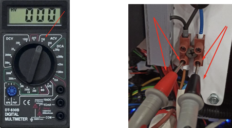 В случае если обогрев перестал работать, необходимо проверить мультиметром (режим измерения переменного тока, более 200 В) (рисунок 5), приходит ли напряжение на колодку, откуда подключается обогрев (рисунок 6).