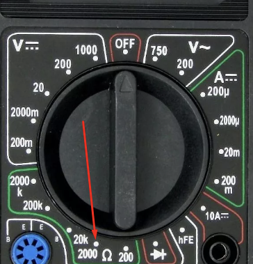 \- на мультиметре выставляем режим проверки сопротивления (2 кОм) (рисунок 9)
